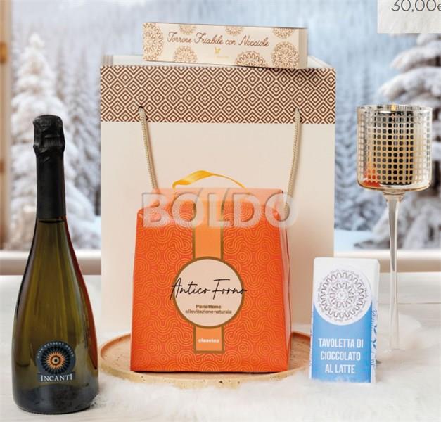 Valigetta: Tavoletta di cioccolato al latte Jacopo Maestri g 100 Torrone friabile con nocciole in astuccio Jacopo Maestri g 100 Panettone classico Antico Forno g 750 Spumante Gran Dessert Incanti cl 75