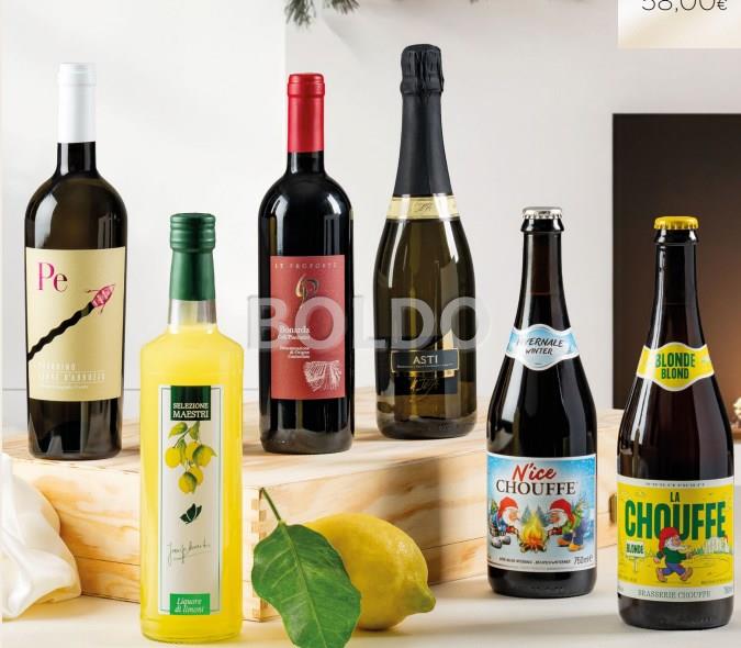 CASSETTA IN LEGNO SEI BOTTIGLIE Birre, Vini, Spumanti e Liquori: Pecorino Abruzzo IGT Pe.Pa. cl 75 Bonarda Secca DOC Le Proposte cl 75 Belgian Blond Ale La Chouffe cl 75 Belgian Strong Dark Ale Chouffe N'Ice cl 75 Spumante Asti DOCG La Doja cl 75 Limoncello Jacopo Maestri cl 70