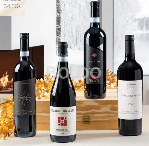 CASSETTA IN LEGNO QUATTRO BOTTIGLIE Selezione Vini Rossi: Valpolicella Superiore DOC Campofaino cl 75 Bolgheri Rosso Mario DOC Fattoria Vecchia cl 75 Barbera d'Alba DOC Bio Podere Gagliassi cl 75 Valpolicella Superiore Classico Ripasso DOC Pietre di Prun cl 75