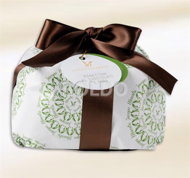 Farcito con pezzi di pera e gocce di cioccolato. L'impasto base del Panettone al Cioccolato è ottenuto tradizionalmente con acqua, farina, burro, uova o anche tuorli. L'impasto è lavorato più volte e poi fatto lievitare per molte ore, in seguito è cotto in forno per un lungo periodo e fatto raffreddare naturalmente. Solo a questo punto ha luogo la farcitura. Si suggerisce di servirlo a fette tagliate verticalmente e di accompagnarlo con vino dolce, come lo spumante o il moscato, o con delle bevande calde come caffè e cioccolato. Per apprezzarne meglio i profumi e i sapori si consiglia, prima di portarlo in tavola, di lasciarlo riposare a temperatura ambiente per almeno 24 ore.